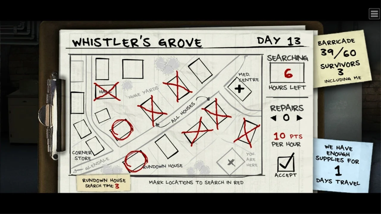 Игра разделена на циклы «день-ночь». Днём вы исследуете окрестности, ищете оружие, боеприпасы и материалы для укрепления базы. Ночью — отбиваете волны зомби, которые стремятся прорваться через баррикады. Если враги пробивают оборону, они атакуют выживших, и вам нужно срочно ликвидировать угрозу, прежде чем союзники смогут восстановить укрепления. С каждой новой ночью зомби становятся сильнее, быстрее и многочисленнее, поэтому стратегия и точность в бою критически важны.