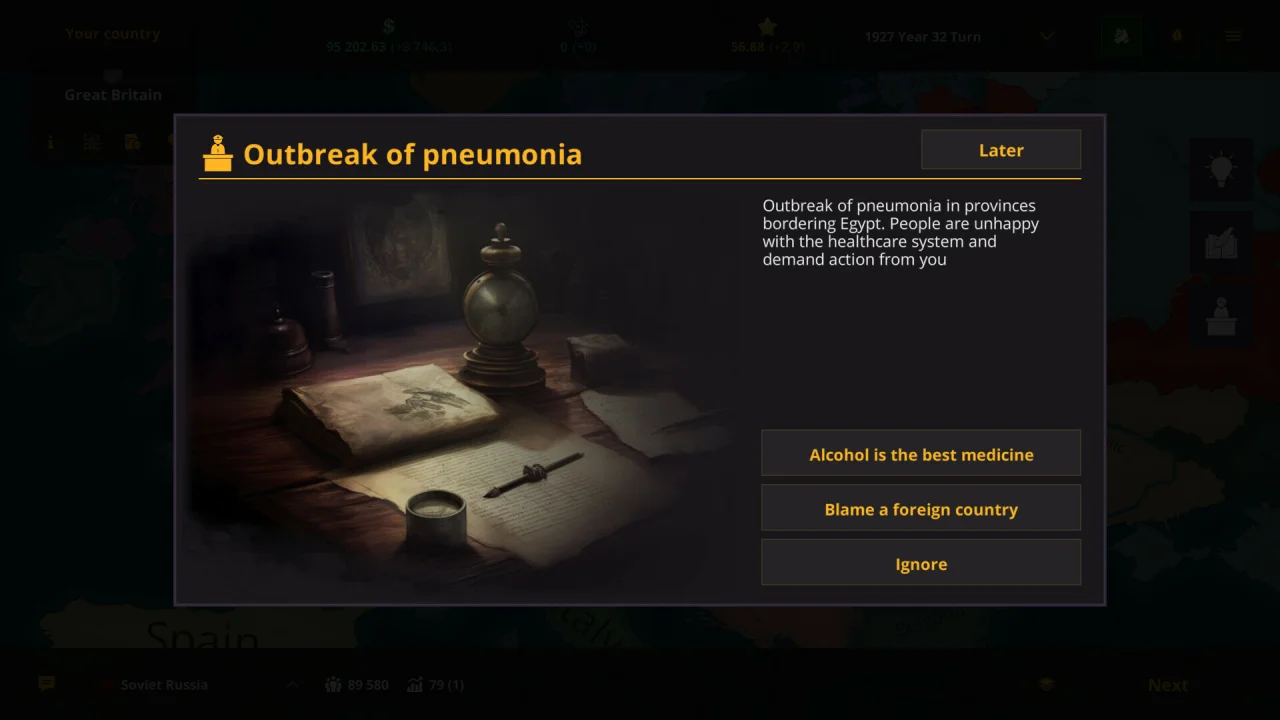 В мире, где история пишется победителями, вы становитесь правителем государства в эпоху великих потрясений. Будете ли вы воссоздавать империи прошлого или построите全新的ую цивилизацию с нуля — ваш выбор определит судьбы миллионов. Столкнётесь ли вы с историческими вызовами или создадите альтернативную реальность, где Наполеон владеет атомной бомбой, а Римская империя вышла в космос — всё в ваших руках.
